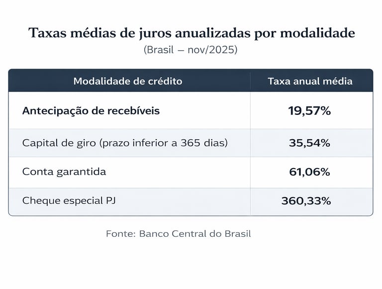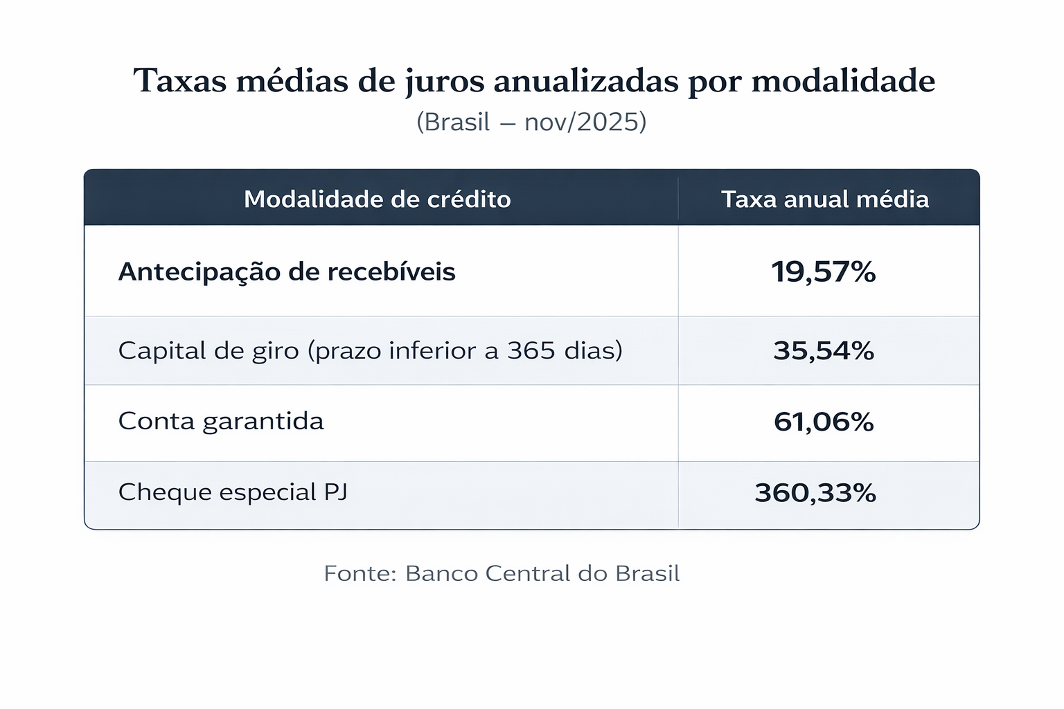 Em comparação com as linhas de crédito discutidas ontem, a antecipação de recebíveis é mais barata, devido a segurança que é providenciada pelo recebimento futuro e, particularmente, por elementos que o tornem certo e possam ser dados em garantia (a duplicata, o cheque, os recebíveis de cartão de crédito etc.). Em novembro de 2025, conforme dados mais recentes do Banco Central do Brasil [3], a taxa média de juros anualizada para esse tipo de operação era 19,57%. Compare-se abaixo com outras modalidades:
